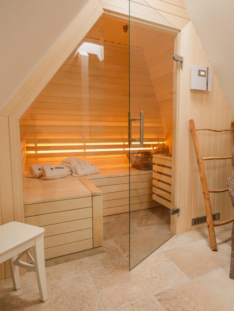 Eine komplette Etage für Ihre körperlich-geistig-seelische Erneuerung: Sauna mit licht-durchfluteter Dusche und Vorraum für Ihre Entspannung.