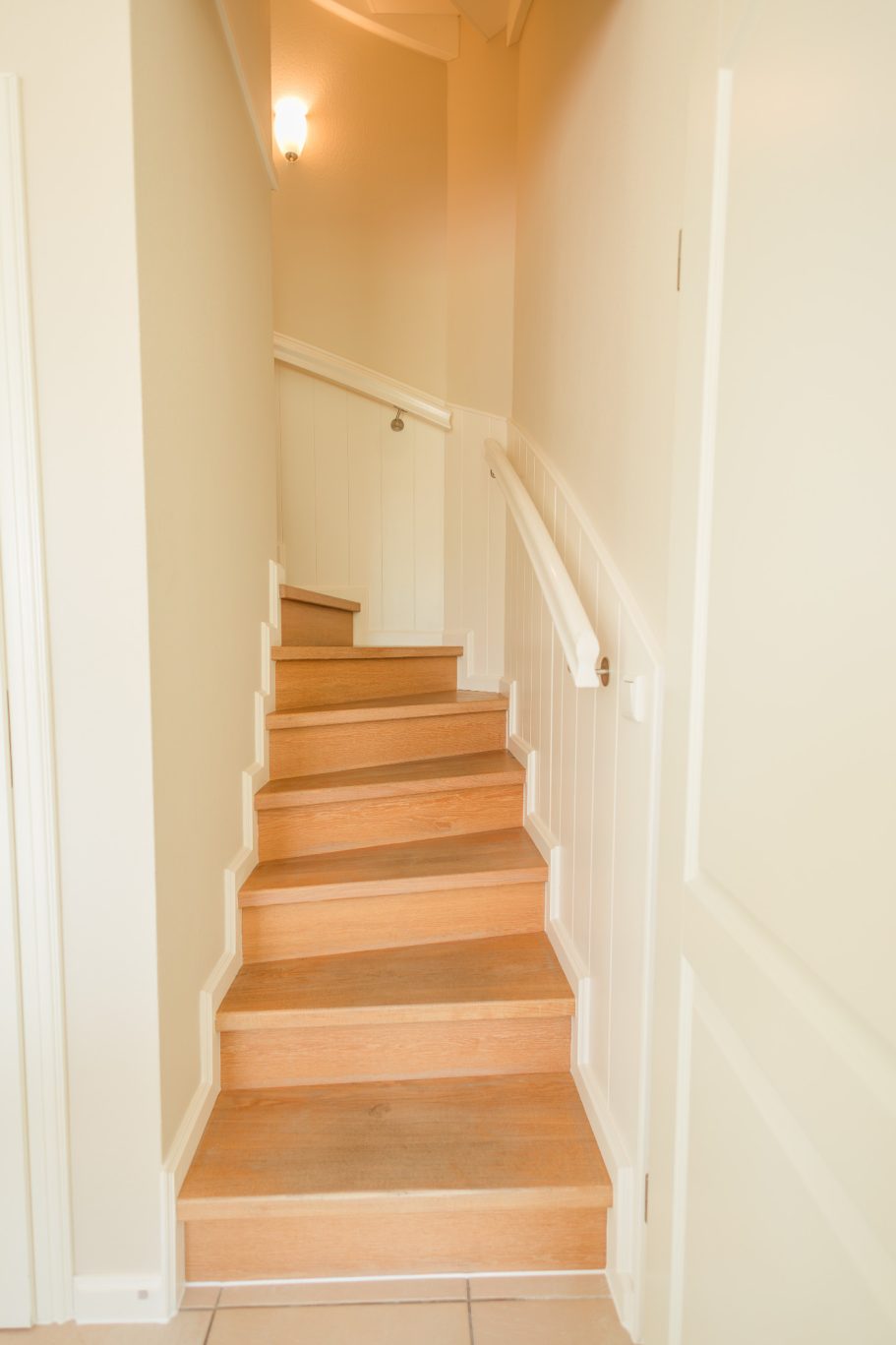 Im Obergeschoss sind beide Schlafzimmer mit jeweils einem Doppelbett ausgestattet. Das nahe Duschbad mit Fußbodenheizung ist angenehm lauschig. In einem Separee im OG abgetrennt, sind Waschmaschine und Trockner gelegen. Ein Doppelbettzimmer verfügt über einen in der Wand eingebauten TV.