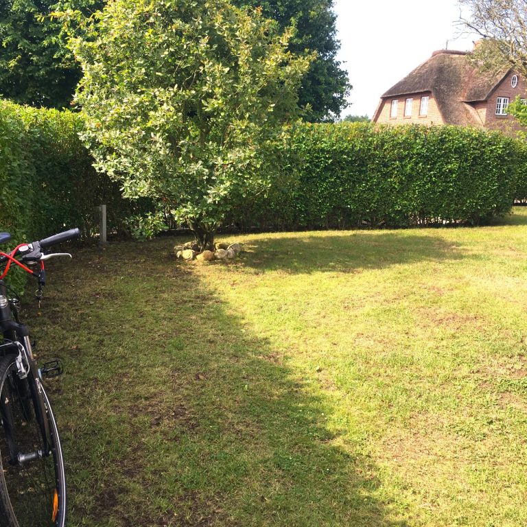 Strandnahe Reetdachhaushälfte mit zwei separaten Terrassen in Süd- (Tag) und West-Ausrichtung (Abendstunden).